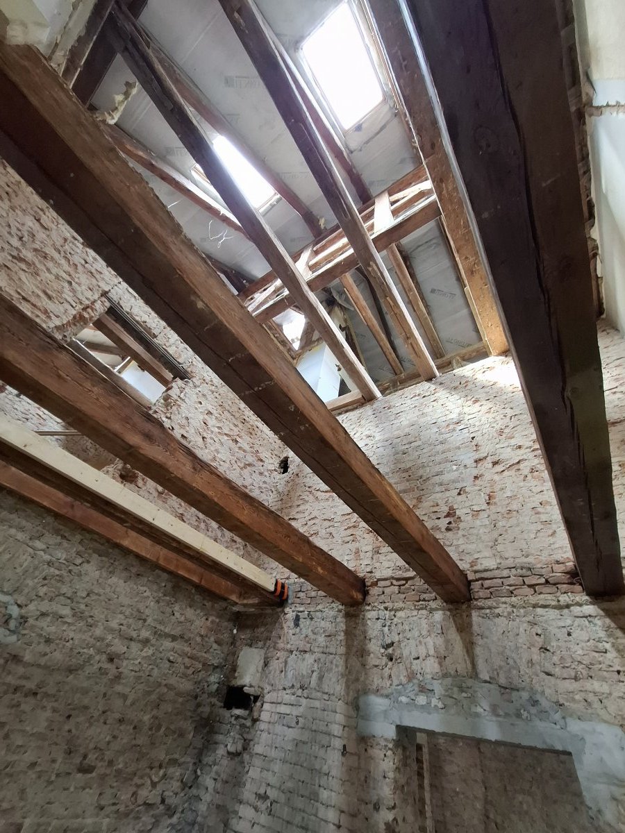 Obecnie trwa demontaż pokrycia dachu, aby wymienić wieżbę dachową. Zakończono już wymianę nadproży, wzmocniono belki stropowe, prowadzone jest osuszanie ścian fundamentowych, a także budowa zewnętrznego wejścia do piwnicy