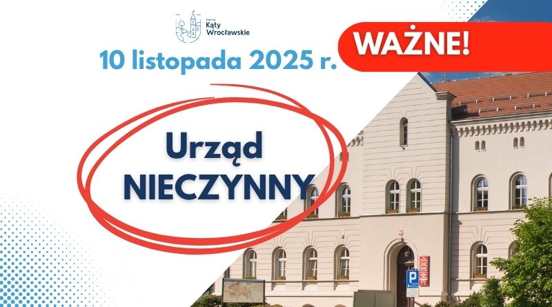 Przypominamy, że w poniedziałek 10 listopada 2025 roku Urząd Miasta i Gminy w Kątach Wrocławskich oraz Biuro Obsługi Klienta w Smolcu będą nieczynne.