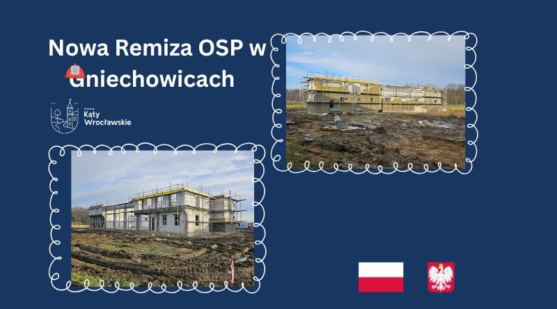 Trwają intensywne prace przy budowie budynku remizy strażackiej dla OSP Gniechowice. Wymurowano ściany konstrukcyjne, zabetonowana wieńce i niebawem rozpocznie się montaż konstrukcji stalowej zadaszenia i montaż stolarki okiennej. Trwają także prace związane z dociepleniem budynku wełną mineralną. Równolegle prowadzone są prace przy zagospodarowaniu terenu przy budynku oraz wykonywana jest podbudowa drogi dojazdowej do całego obiektu.