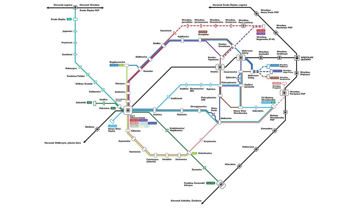 - Połączenia z Wrocławiem*, Bielanami Wrocławskimi, Środą Śląską oraz Pustkowem Żurawskim