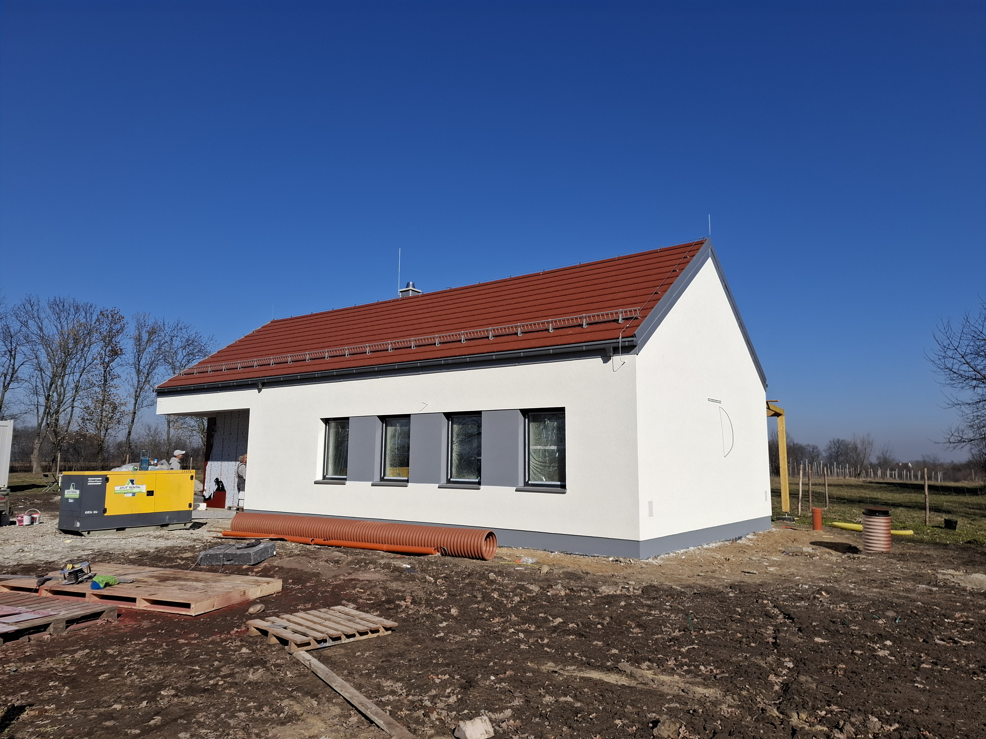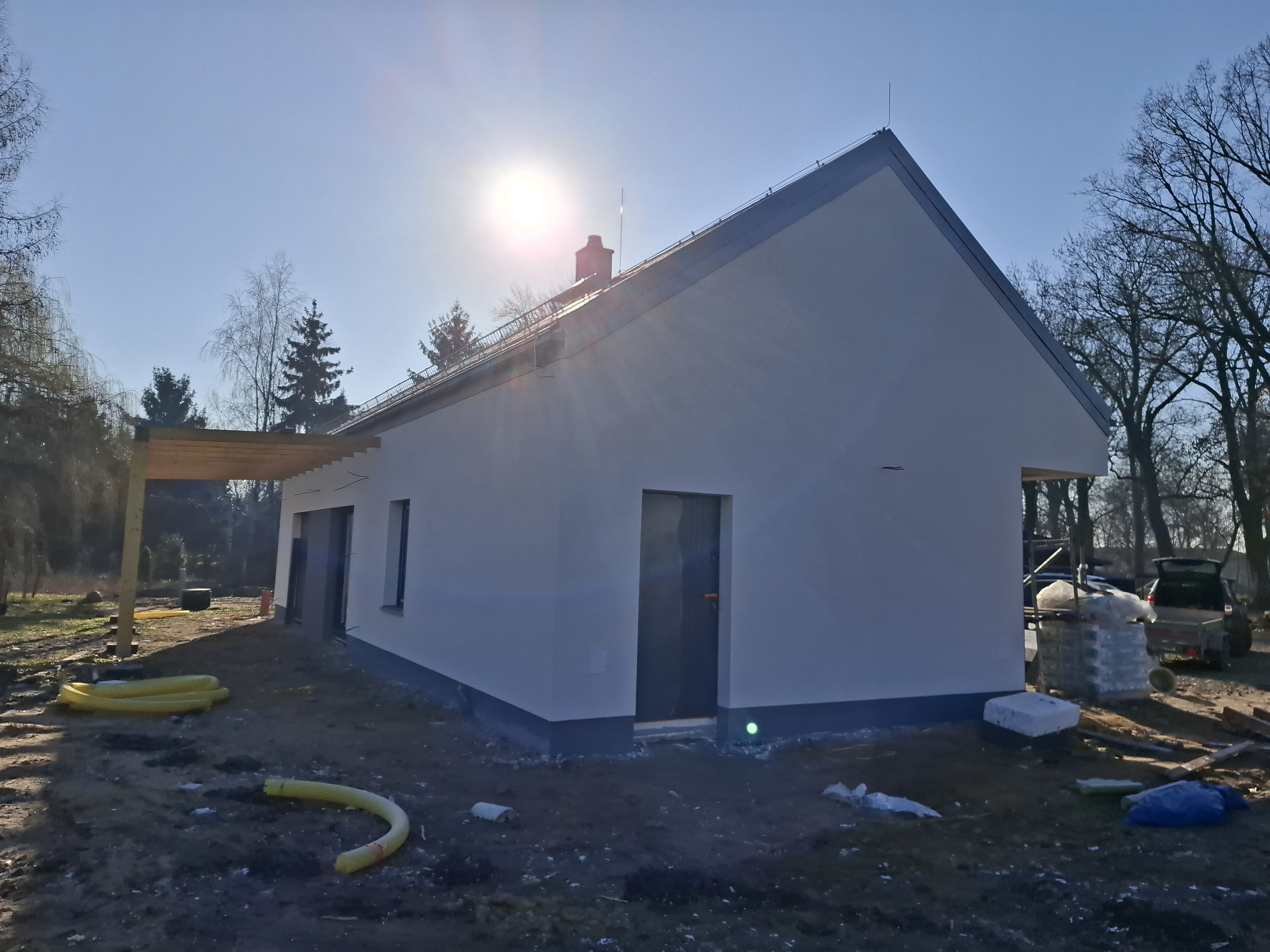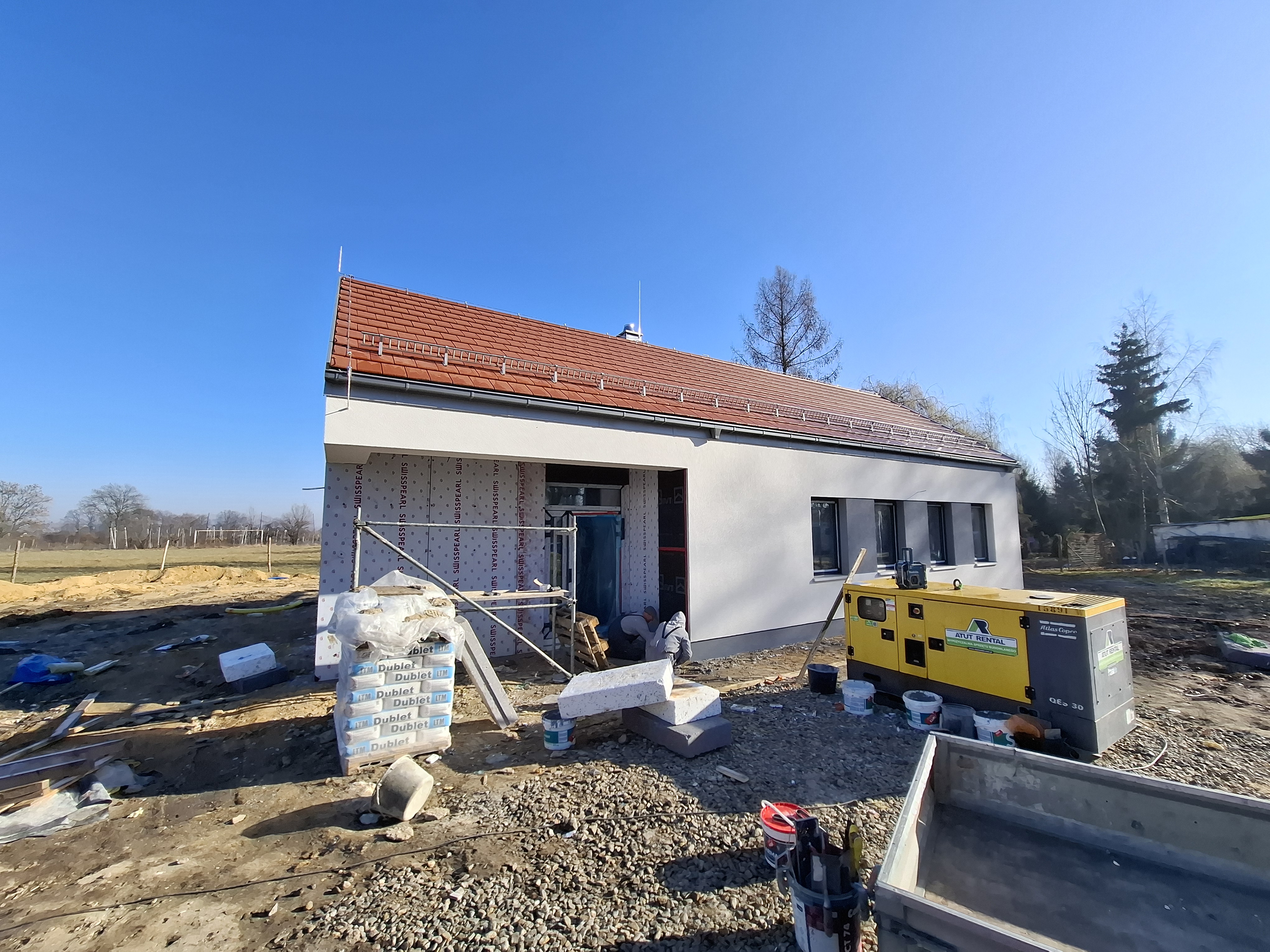 Wykonano tynki zewnętrzne, parapety zewnętrzne, elewację wentylowaną przed wejściem do budynku, konstrukcję pergoli a także zadaszenie budynku.