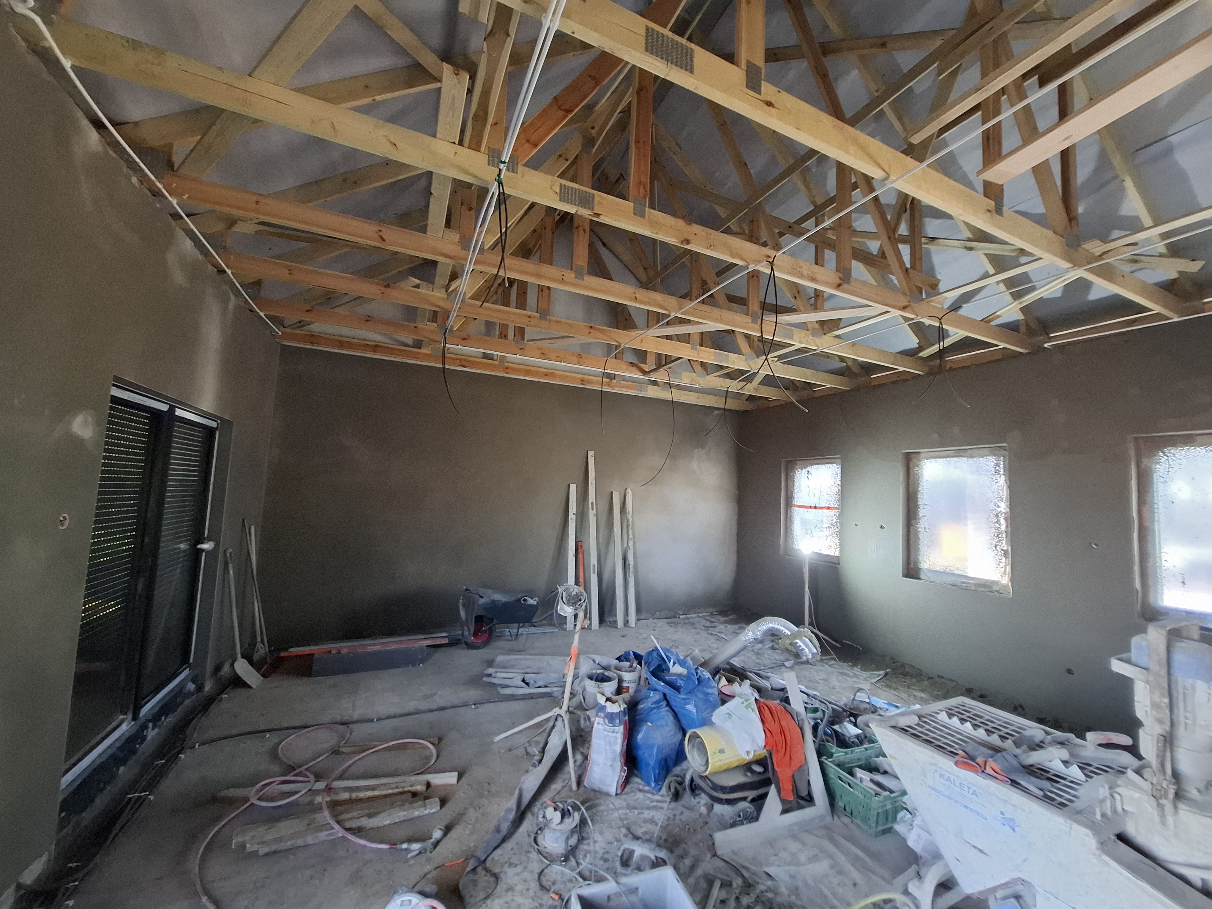 Trwają prace tynkarskie wewnątrz obiektu.