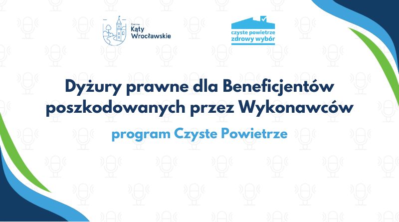 Informujemy, że zostały uruchomione bezpłatne dyżury prawne dla pokrzywdzonych Beneficjentów programu Czyste Powietrze. To okazja, aby zasięgnąć porady eksperta w przypadku problemów z nieuczciwym wykonawcą. Organizatorem spotkań jest WFOŚiGW we Wrocławiu.