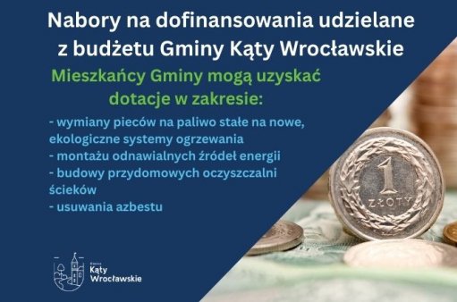 Mieszkańcy Gminy Kąty Wrocławskie, na podstawie regulaminu udzielania dotacji celowej na dofinansowanie zadań z zakresu ochrony środowiska obejmujących trwałą zmianę systemu ogrzewania opartego na paliwie stałym na nowe, ekologiczne źródło ciepła, mogą ubiegać się o dofinansowanie do wymiany ogrzewania.