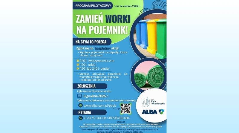 Ze względu na bardzo duże zainteresowanie programem informujemy, że: osoby, które nie zdążyły się zgłosić, a chciałyby otrzymać pojemnik, mogą to zrobić do  6 grudnia wypełniając wniosek na stronie www.alba.com.pl/ebok Wnioski złożone do tego terminu zostaną ujęte w kolejnej turze wydawania pojemników.
